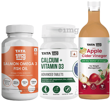 Combo Pack of Tata 1mg Calcium + Vitamin D3 Advanced Tablet (60), Salmon Omega 3 Fish Oil Capsule (60) and Organic Apple Cider Vinegar (500ml)