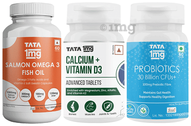 Combo Pack of Tata 1mg Calcium + Vitamin D3 Advanced Tablet (60), Salmon Omega 3 Fish Oil Capsule (60) and Probiotics 30 Billion CFUs+ Capsule (60)