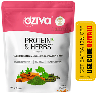 Oziva Protein & Herbs Whey Protein | For Metabolism, Energy, Skin & Hair | For Women| Flavour Mango