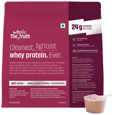 The Whole Truth Whey Protein 24g Protein/scoop | Isolate+Concentrate | Light & Easy to Digest Light Cocoa