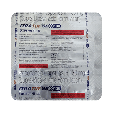 - इट्राटुफ एसबी 130 कैप्सूल से मुंह, त्वचा, योनि या शरीर के किसी भी अन्य भाग के फंगल इन्फेक्शन का इलाज करने में मदद मिलती है.