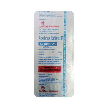 - Hypoglycemia (low blood sugar level) may occur if AC Bose 25 Tablet is taken along with other antidiabetic medicines, alcohol, or by delaying/skipping a meal. Check your blood sugar levels and have a snack/sugar source for immediate relief.