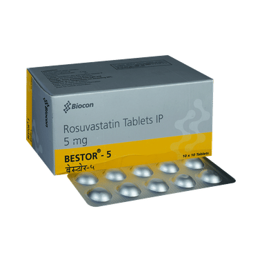 Bestor 5 Tablet helps lower bad cholesterol (LDL) in the blood, which prevents fat from building up in the arteries. This keeps blood vessels clear and reduces the risk of heart problems like heart attacks and strokes. It also slightly increases good cholesterol (HDL), which helps remove bad cholesterol from the body.