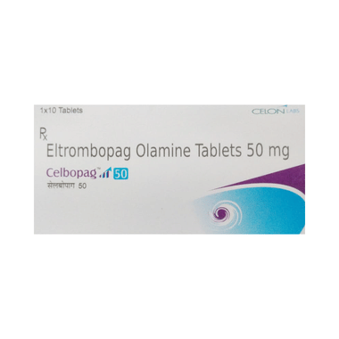 Celbopag 50 Tablet is used to increase the number of platelets (cells that help the blood clot) to decrease the risk of bleeding in adults and children 1 year of age and older who have chronic idiopathic thrombocytopenic purpura (ITP, an ongoing condition that may cause unusual bruising or bleeding due to an abnormally low number of platelets in the blood). It is used in patients who have not benefited or cannot be treated with other treatments, including medications or surgery to remove the spleen. Celbopag 50 Tablet is also used to increase the number of platelets in people who have hepatitis C (a viral infection that may damage the liver). It is usually given along with other medicines.