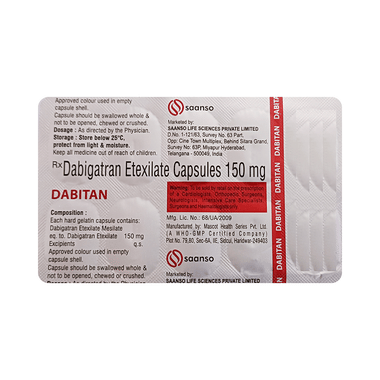 Dabitan Capsule helps treat and prevent deep vein thrombosis, a condition in which blood clots form in the deep veins, usually in the legs. It works by preventing the clot from growing larger and reducing the chance of new clots forming. This helps improve blood flow, relieves symptoms such as pain and swelling, and lowers the risk of serious complications caused by clot movement.