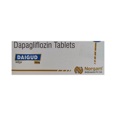 Daigud 10mg Tablet is a medicine that helps to control high blood glucose (sugar) levels. It helps get rid of extra glucose from your body through urine. Lowering blood glucose levels is an essential part of managing diabetes. If you can control the level, you will reduce the risk of getting any of the serious complications of diabetes, such as kidney damage, eye damage, nerve problems, and loss of limbs. Taking this medicine regularly along with a proper diet and exercise will help you live a normal, healthy life. You should keep using it for as long as it is prescribed because it is protecting your future health.