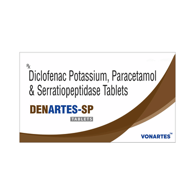 Denartes-SP Tablet is a combination of medicines that is used for short term relief of pain, inflammation and swelling. It inhibits release of those chemical messengers in the brain that tell us that we have pain. It effectively relieves back pain, earache, throat pain, toothache, periods pain and pain due to arthritis too.