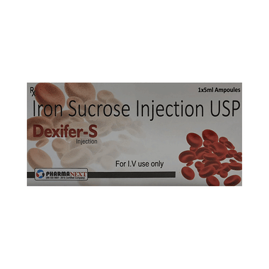 Anemia is a condition where your body does not have enough red blood cells to carry oxygen around your body. If you do not have enough iron from the foods you eat (because of poor nutrition or poor absorption of the mineral), your body will produce fewer red blood cells and can cause anemia. Dexifer-S Injection is an iron replacement product. It can boost your levels of red blood cells and reduce the symptoms of anemia such as tiredness and weakness. This medicine is given as an injection by a doctor or nurse. You should not have this medicine if your anemia is not caused by a lack of iron.