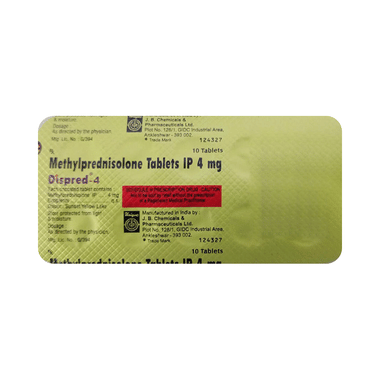 Dispred 4mg Tablet prevents the release of substances in the body that cause inflammation. It can be used to treat different inflammatory and allergic conditions of the skin such as eczema and psoriasis. It works by lowering your immune system’s response to these conditions thereby relieving symptoms such as swelling, pain, itching and other allergic-type reactions.