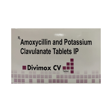 Divimox CV Tablet is an oral antibacterial combination of amoxicillin and clavulanic acid. It is used to treat a wide range of bacterial infections. It is commonly prescribed to treat infections such as ear infections (otitis media), sinus infections (bacterial rhinosinusitis), respiratory infections (pneumonia, bronchitis), and skin and soft tissue infections (cellulitis, abscesses).