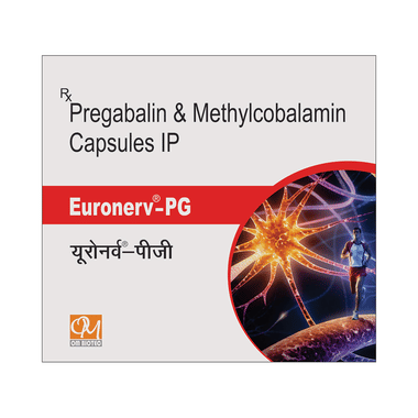 Euronerv-PG Capsule is a combination of medicines used to treat long-lasting (chronic) pain caused by nerve damage due to diabetes, shingles or spinal cord injury. It reduces pain and its associated symptoms such as mood changes, sleep problems, and tiredness. Pregabalin, an active ingredient of this medicine, is thought to work by interfering with pain signals that travel through the damaged nerves and the brain. It also contains nutritional supplements that improve nerve conduction. Taking Euronerv-PG Capsule regularly will improve your physical and social functioning and overall quality of life.
