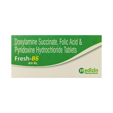 Fresh-B6 Tablet blocks the action of chemicals in the body that can make you feel or be sick during pregnancy. This medicine helps you cope up with nausea or vomiting that occurs due to hormonal changes during pregnancy and helps you complete the term without much discomfort. It also contains nutritional supplements that improve your baby’s immune system, enhance the baby’s brain development and also help reduce nausea and vomiting during pregnancy.