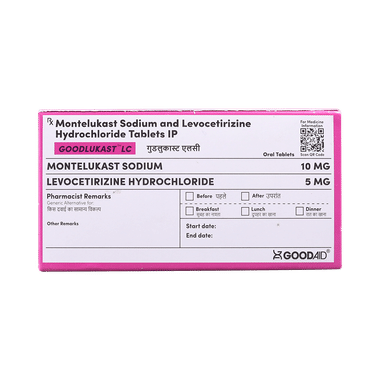 Goodlukast LC Tablet is a medicine that provides relief from symptoms such as a blocked or runny nose, sneezing, and itchy or watery eyes. This will make it easier for you to go about your daily activities. It rarely has any serious side effects, and you may only need to take it on days you have symptoms. If you are taking it to prevent getting symptoms, you should use it regularly to get the most benefit.