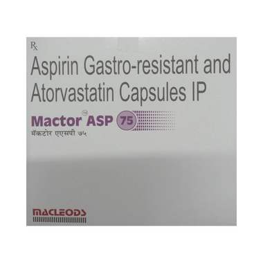 Mactor ASP 75 Capsule is a combination medicine that is used to prevent heart attack. It contains Atorvastatin that works by reducing the amount of “bad” cholesterol (LDL) and raising the amount of “good” cholesterol (HDL) in your blood. High levels of cholesterol can cause your blood vessels to narrow (atherosclerosis). Lowering the amount of cholesterol reduces the chances of heart diseases and stroke and helps you remain healthier for longer.
