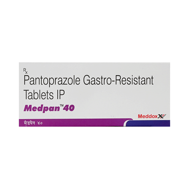 Medpan 40 Tablet is also used to prevent stomach ulcers and acidity that may be seen with the prolonged use of painkillers. It belongs to a class of medicines known as proton pump inhibitors (PPIs). This medicine should be taken one hour before a meal, preferably in the morning. The dose will depend on your underlying condition and how you respond to the medicine. You should keep on taking it as prescribed even if your symptoms disappear quickly. You can increase the efficiency of the treatment by eating smaller meals more often and avoiding caffeinated drinks (like tea and coffee), and spicy or fatty foods.