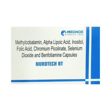Nurotech BT Capsule is a combination of Methylcobalamin, Alpha Lipoic Acid, Myo-Inositol, Folic Acid, Chromium Picolinate, Selenium, and Benfotiamine. Methylcobalamin is a form of vitamin B12 that restores its level in the body thereby helping in treating certain anemias and nerve problems. Alpha lipoic acid acts as a potent antioxidant (substance that protects against cell damage) by neutralizing the free radicals (waste products formed in the body during energy production) such as reactive oxygen and nitrogen species. Further, it initiates natural antioxidant processes in the body. It also maintains the levels of Vitamin E and Vitamin C in the body. Myo-inositol works by relaxing the blood vessels and improving blood flow to the legs, toes and fingers, thereby relieving pain. Folic Acid is a form of vitamin B. It plays a vital role in the formation of red blood cells, which carry oxygen throughout the body. It is also essential in pregnancy due to its role in the development of the unborn baby's brain and spinal cord. Chromium Picolinate, Selenium, and Benfotiamine are nutritional supplements that provide essential nutrients to our body and improve overall health.