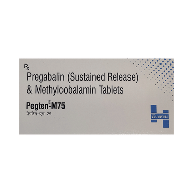 Pegten-M75 Tablet SR is a combination of medicines used to treat long-lasting (chronic) pain caused by nerve damage due to diabetes, shingles or spinal cord injury. It reduces pain and its associated symptoms such as mood changes, sleep problems, and tiredness. Pregabalin, an active ingredient of this medicine, is thought to work by interfering with pain signals that travel through the damaged nerves and the brain. It also contains nutritional supplements that improve nerve conduction. Taking Pegten-M75 Tablet SR regularly will improve your physical and social functioning and overall quality of life.