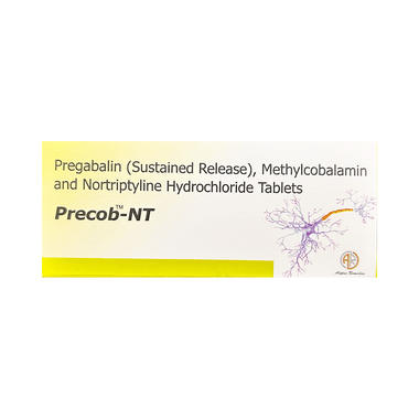 Precob-NT Tablet SR is a combination of medicines used to treat long-lasting (chronic) pain caused by nerve damage due to diabetes, shingles, or spinal cord injury. It reduces pain and its associated symptoms such as mood changes, sleep problems, and tiredness. It is thought to work by interfering with pain signals that travel through the damaged nerves and the brain. It also contains nutritional supplements that are essential for improving nerve conduction.