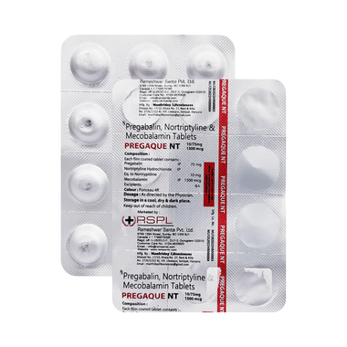 Pregaque NT Tablet is a combination of medicines used to treat long-lasting (chronic) pain caused by nerve damage due to diabetes, shingles, or spinal cord injury. It reduces pain and its associated symptoms such as mood changes, sleep problems, and tiredness. It is thought to work by interfering with pain signals that travel through the damaged nerves and the brain. It also contains nutritional supplements that are essential for improving nerve conduction.