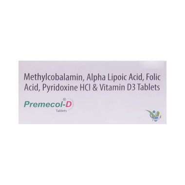 Premecol-D Tablet is a combination of five nutritional supplements. Methylcobalamin is an active form of Vitamin B 12. This helps in proper cell growth and development, helps in protein synthesis and production of blood cells (red and white blood cells). Alpha Lipoic Acid is an antioxidant that repairs cell damage and restores vitamin level in the body, it also improves the functions of the nerves. Vitamin B6 (Pyridoxine) and Vitamin D3 are vitamin nutritional supplements that regulate essential metabolic functions in the body for proper growth and development. Folic Acid is also known as folate or vitamin B9. It helps in producing blood (hemoglobin) in the body. This is how it works in the treatment of nutritional deficiencies.