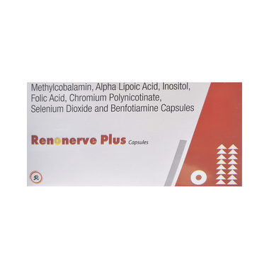 Renonerve Plus Capsule is a combination of Methylcobalamin, Alpha Lipoic Acid, Myo-Inositol, Folic Acid, Chromium Picolinate, Selenium, and Benfotiamine. Methylcobalamin is a form of vitamin B12 that restores its level in the body thereby helping in treating certain anemias and nerve problems. Alpha lipoic acid acts as a potent antioxidant (substance that protects against cell damage) by neutralizing the free radicals (waste products formed in the body during energy production) such as reactive oxygen and nitrogen species. Further, it initiates natural antioxidant processes in the body. It also maintains the levels of Vitamin E and Vitamin C in the body. Myo-inositol works by relaxing the blood vessels and improving blood flow to the legs, toes and fingers, thereby relieving pain. Folic Acid is a form of vitamin B. It plays a vital role in the formation of red blood cells, which carry oxygen throughout the body. It is also essential in pregnancy due to its role in the development of the unborn baby's brain and spinal cord. Chromium Picolinate, Selenium, and Benfotiamine are nutritional supplements that provide essential nutrients to our body and improve overall health.