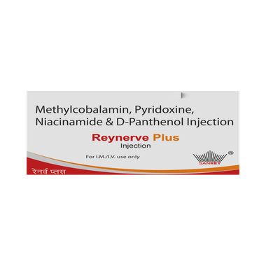Reynerve Plus Injection is a combination of four nutritional supplements from vitamin family. Methylcobalamin is a form of vitamin B12 that restores its level in the body thereby helping in treating certain anemias and nerve problems. Vitamin B6 (Pyridoxine) or vitamin B6 provides essential nutrients to regulate different functions of the body. Niacinamide is a form of vitamin B3 that helps to provide energy and improves the health of your skin. D-Panthenol is also known as vitamin b5 that helps in proper utilization of other nutrients such as carbohydrate, fat, and protein. Thus, Reynerve Plus Injection helps to provide proper nutrition.