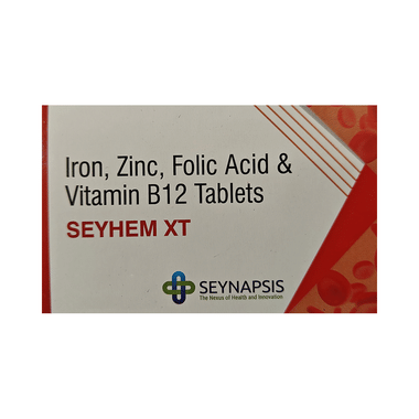 Seyhem XT Tablet is a combination of vitamins and minerals. Iron replenishes the iron stores in the body and corrects iron deficiency anemia. Zinc is needed for the body's immune system to work properly. It plays a role in growth, wound healing, and maintaining gut health. Zinc is also needed for the senses of taste and smell. Folic acid is essential for production of red blood cells. It prevents and treats folate deficiency and anemia. When taken by pregnant women, Folic acid prevents miscarriage, preterm labor, and neural tube defects in infants. Vitamin B12 corrects vitamin B12 deficiency thereby helping in treating certain anemias and nerve problems.