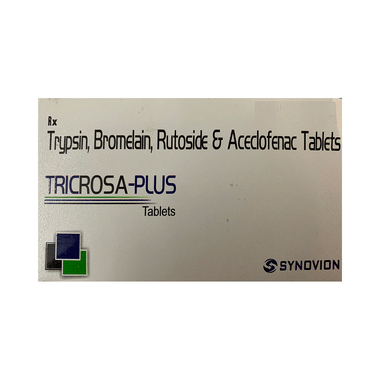 Tricrosa-Plus Tablet is a combination of four medicines: Trypsin, Rutoside, Bromelain and Aceclofenac. Trypsin and Bromelain are enzymes. They increase blood supply and make the body produce substances that fight pain and swelling. Rutoside is an antioxidant that protects the body from damage by chemicals (free radicals) and further reduces swelling. Aceclofenac is a non-steroidal anti-inflammatory drug (NSAID) which works by blocking the release of certain chemical messengers (prostaglandins) in the brain that cause pain and inflammation (redness and swelling).