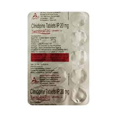 Twinblock 20 Tablet is a calcium channel blocker. It works by relaxing the blood vessels so that blood can flow more easily around your body. This lowers your blood pressure and reduces your risk of having a stroke, a heart attack, or kidney problems in the future. You do not usually feel any direct benefit from taking this medicine, but it works in the long term to keep you well. Take it regularly, as prescribed, for this medicine to be most effective, even if you feel better.