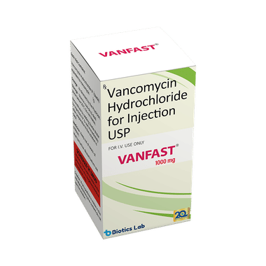 Vanfast 1000mg Injection is also used for the prevention of infection in some high-risk patients undergoing surgical procedures. It works by stopping the growth of bacteria and is useful for treating adults as well as children. It is a narrow-spectrum antibiotic that only covers the gram-positive type of bacteria. This medicine is administered slowly by a drip (infusion) into a vein, under the supervision of a healthcare professional. A rapid infusion can lead to reactions such as low blood pressure, wheezing, shortness of breath, or itching. It may also be combined with other antibiotics to treat additional types of bacteria.