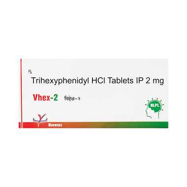 Parkinson’s disease (PD) is a disorder of the central nervous system. It makes the muscles stiff which causes difficulties in standing and walking. PD also causes tremors and loss of balance. Vhex 2 Tablet helps to treat the symptoms of Parkinson's Disease. It relaxes the stiff muscles and helps in easy movement without losing balance. Vhex 2 Tablet is also used to treat side effects like abnormal movements caused by antipsychotic drugs.