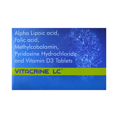 Vitacrine LC Tablet is a combination of five nutritional supplements. Methylcobalamin is an active form of Vitamin B 12. This helps in proper cell growth and development, helps in protein synthesis and production of blood cells (red and white blood cells). Alpha Lipoic Acid is an antioxidant that repairs cell damage and restores vitamin level in the body, it also improves the functions of the nerves. Vitamin B6 (Pyridoxine) and Vitamin D3 are vitamin nutritional supplements that regulate essential metabolic functions in the body for proper growth and development. Folic Acid is also known as folate or vitamin B9. It helps in producing blood (hemoglobin) in the body. This is how it works in the treatment of nutritional deficiencies.