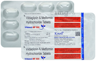 Metformin + Vildagliptin is a combination of two anti-diabetic drugs: Metformin and Vildagliptin. Metformin is an anti-diabetic medicine and belongs to the class of biguanides. It lowers the glucose production in the liver, delays glucose absorption from the intestines and increases the body's sensitivity to insulin. Vidagliptin inhibits the enzyme DPP4 inhibitor and increases the release of insulin from the pancreas. This combination is not advised for the patients below 18 years of age.