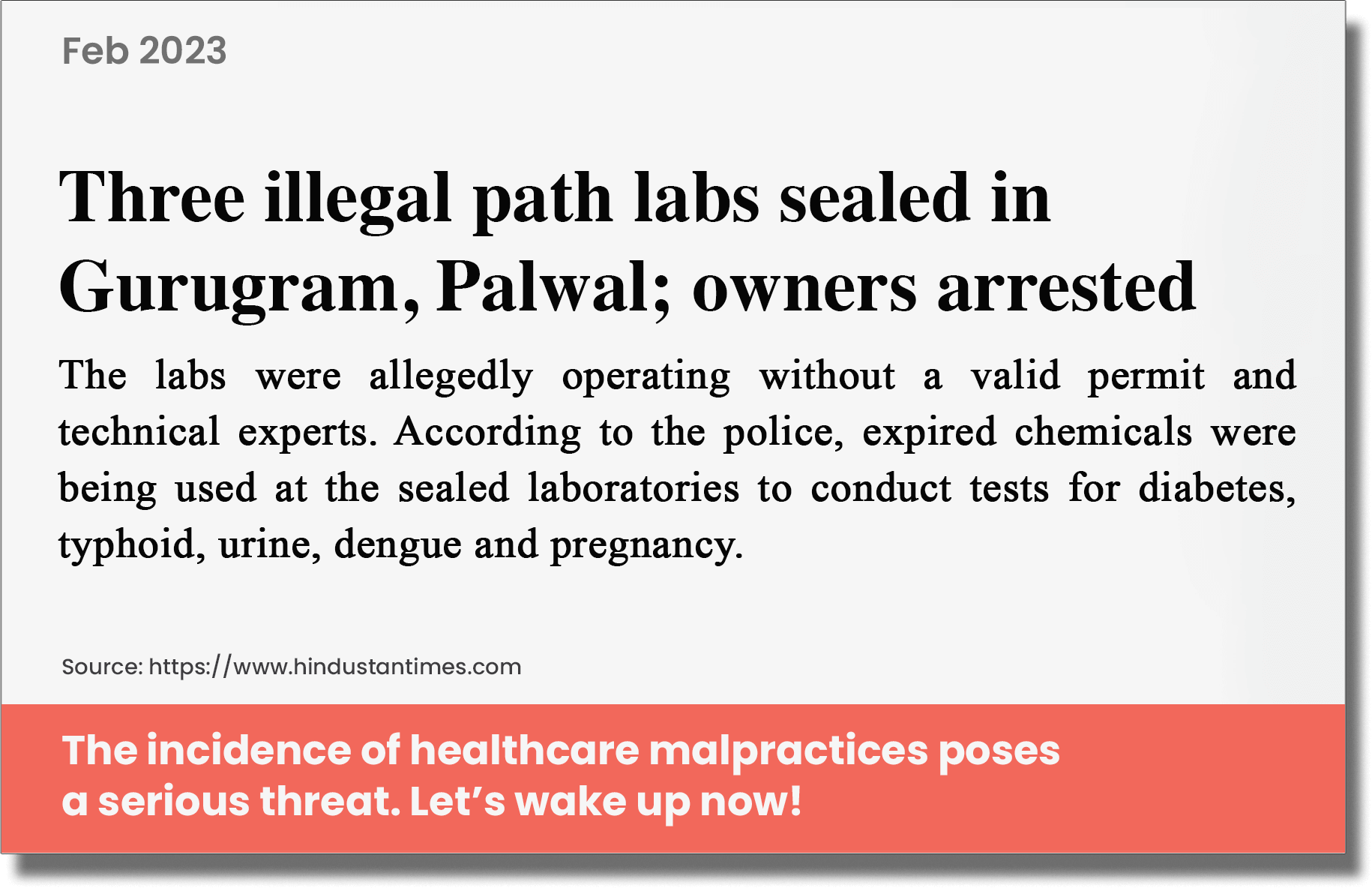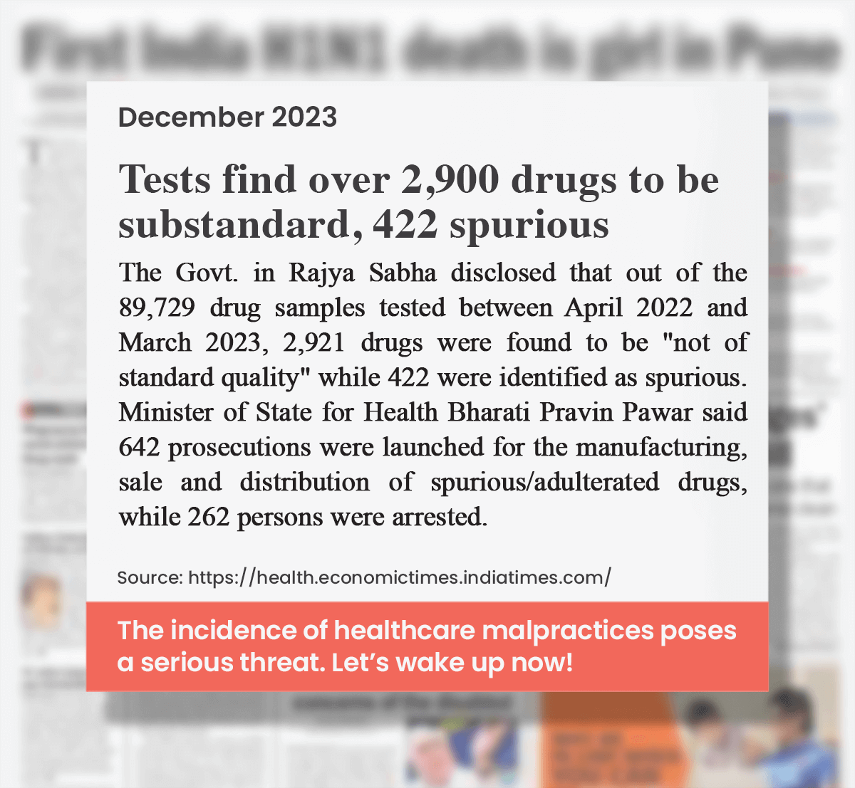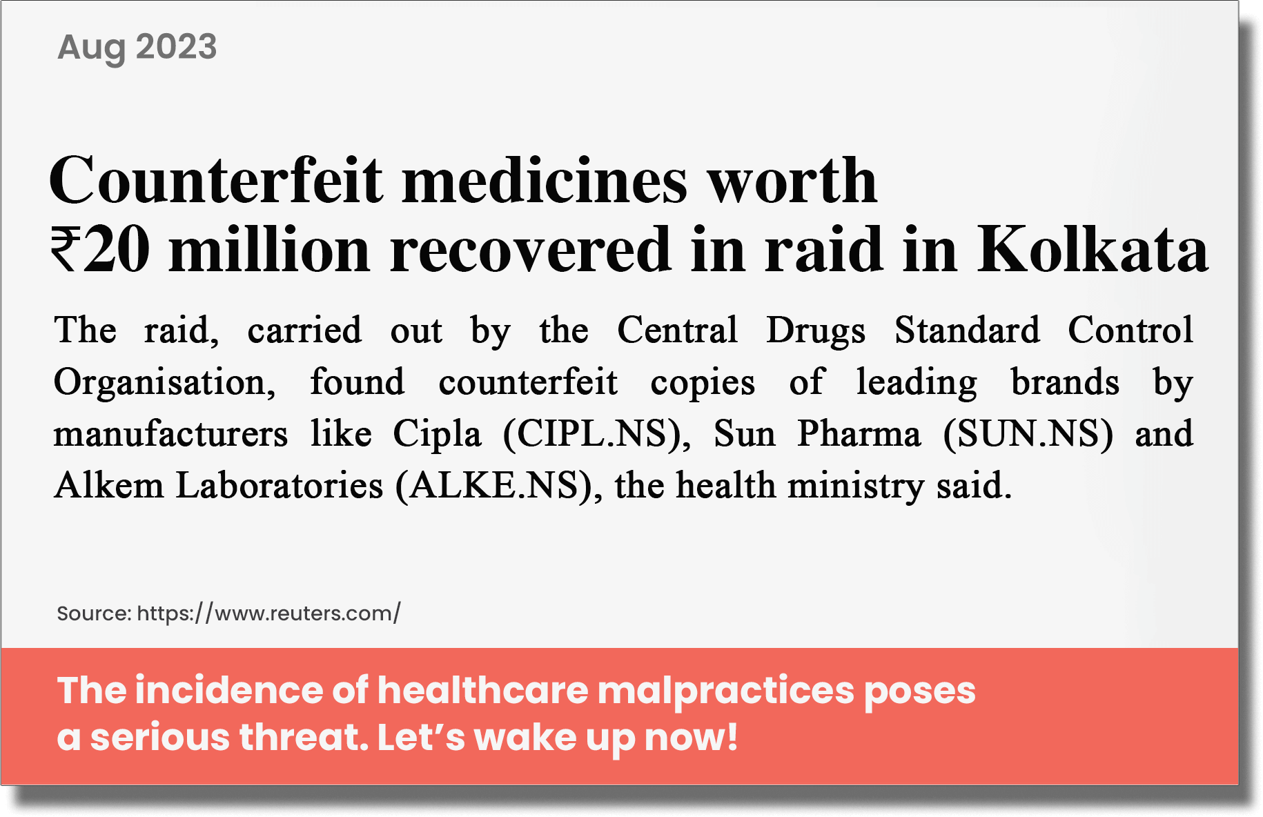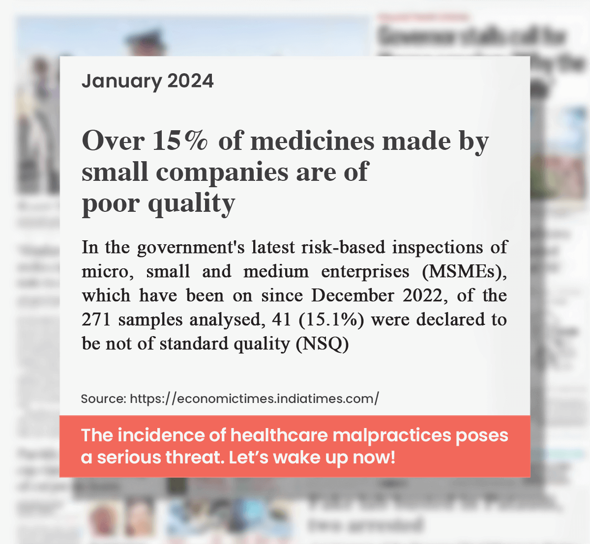 A report by the US Trade Representative office in 2019 stated that up to 20% of the medicines sold in India were counterfeit. In diagnostics, unauthorized and uncertified labs, wrongly conducted tests and inaccurate reports pose a major threat to quality healthcare*.