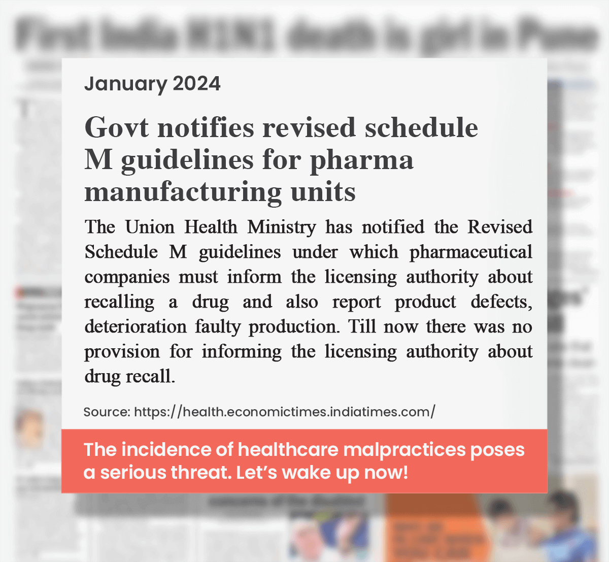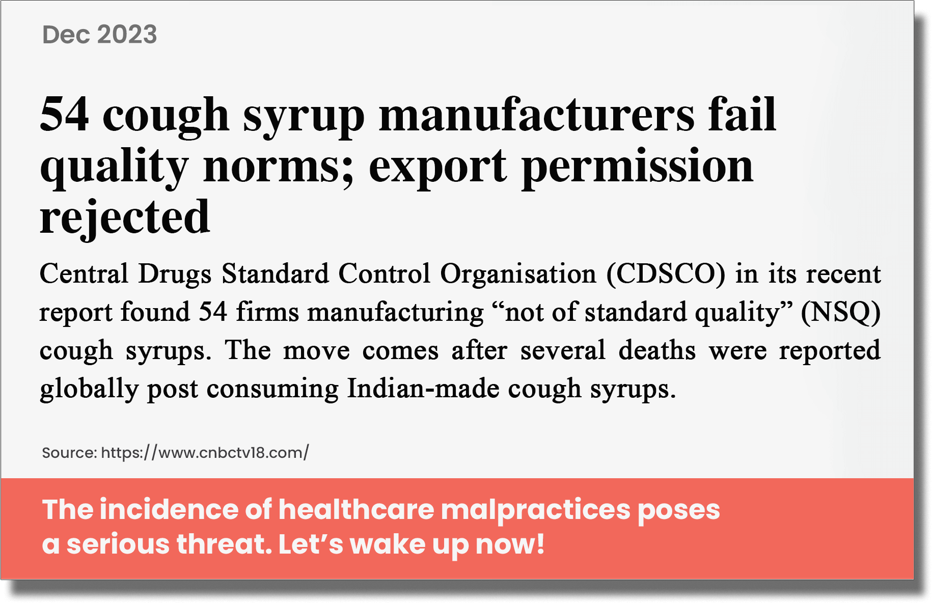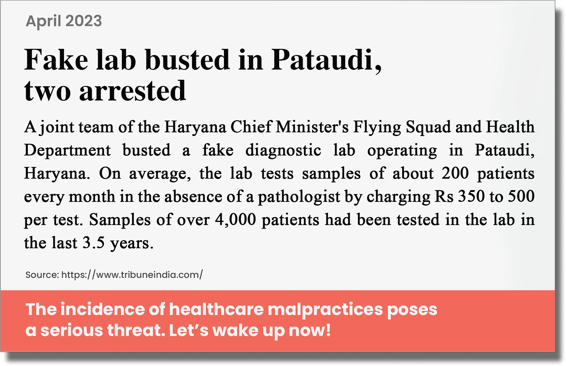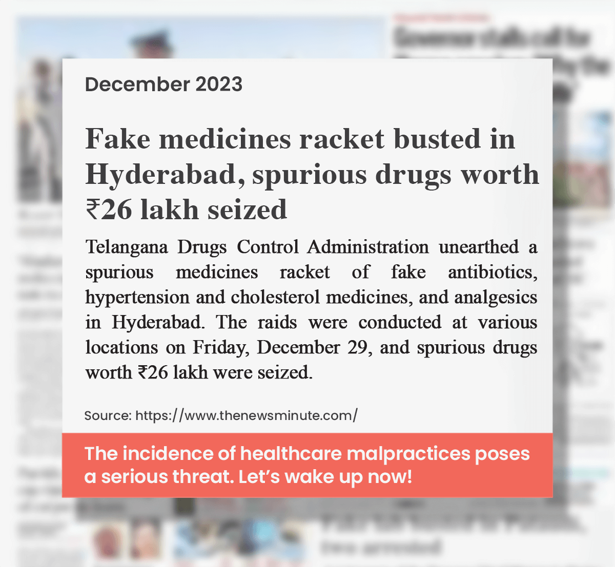 A report by the US Trade Representative office in 2019 stated that up to 20% of the medicines sold in India were counterfeit. In diagnostics, unauthorized and uncertified labs, wrongly conducted tests and inaccurate reports pose a major threat to quality healthcare*.