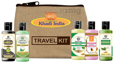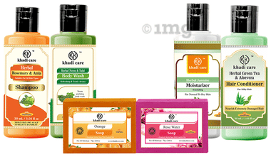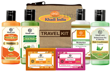 Khadi Care Herbal Handmade Ayurvedic Sustainable Beauty Travel Kit is a comprehensive set of herbal skincare and haircare products designed for convenience during travel. It contains Herbal Rosemary & Amla Shampoo, Herbal Green Tea & Aloe Vera Hair Conditioner, Herbal Neem & Tulsi Body Wash, Herbal Jasmine Moisturizer, and Herbal Face Wash. This carefully curated set is enriched with natural and herbal ingredients to nourish, cleanse, and protect your skin and hair.