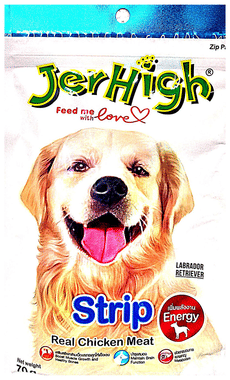 JerHigh Strip Dog Treats is a type of dog snack made with chicken meat to provide a source of protein and is designed to be suitable for dogs of all breeds and sizes. It has a high protein content and is formulated to provide essential nutrients for a healthy dog