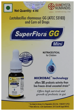 Superflora GG Oral Drops / Probiotic Support For Children / Neutral Taste / Supports Gut Health & Immunity Oral Drops is a probiotic supplement that contains Lactobacillus rhamnosus GG (MicrobacTM GG) which is used to manage diarrhoea and antibiotic-associated diarrhoea. It can also help improve and restore the natural microflora. Free from allergens and with a neutral taste, it is suitable for children aged 4 to 6 years, ensuring easy consumption. Each serving provides essential probiotics in a convenient drop format for daily use.