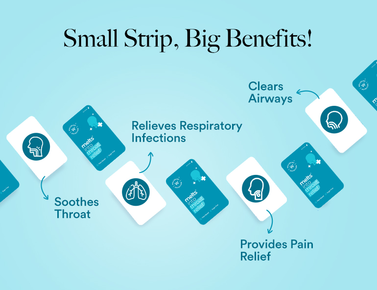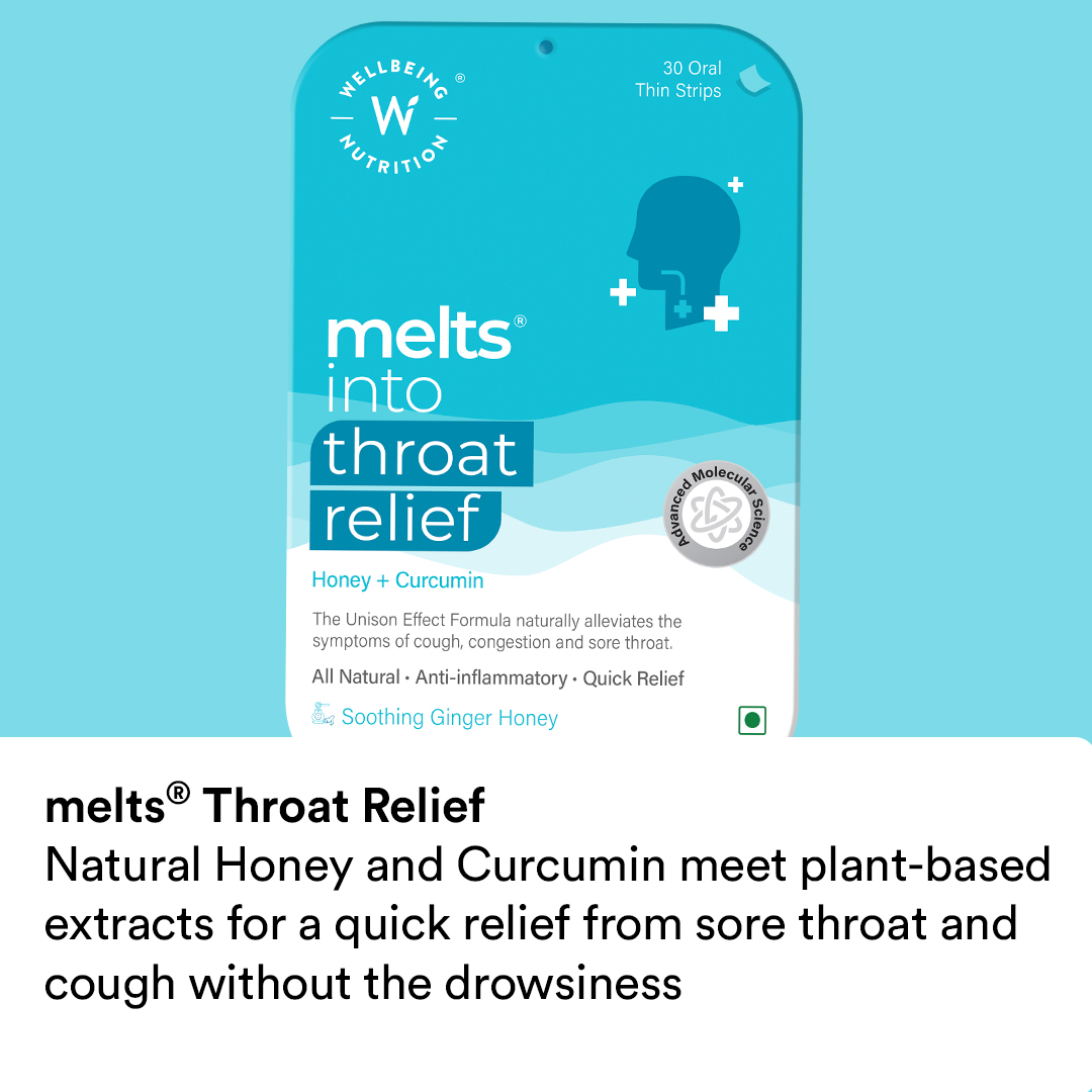 Wellbeing Nutrition Melts Into Throat Relief is formulated with mint, honey and other herbal ingredients to deliver a precise dose of bioactive ingredients that alleviate symptoms of cough, cold and congestion. Melts oral strips are clinically proven and 100% bioactive using patented German Nano Technology to help you beat wet or dry cough relief, low immunity, Cold and cough relief, chest congestion relief, and respiratory infections and also boost the lysozymes count in your saliva which increases immunity and reduces respiratory problems while keeping the lungs cleaner. Clinically proven and formulated using only natural ingredients that help provide immediate relief from sore throat.