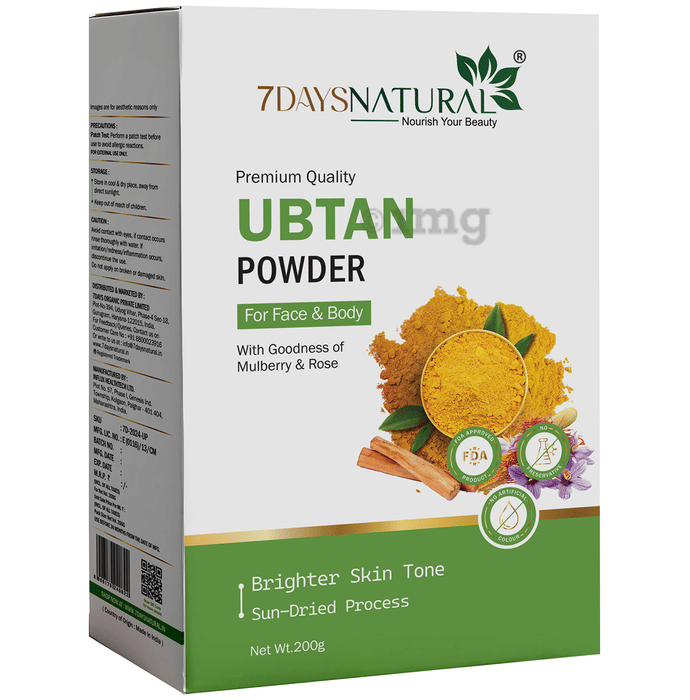 7 Days Natural Organic Ubtan Powder is a thoughtfully crafted blend for both face and body care. This 200g pack combines the properties of mulberry and rose with ingredients to create a versatile skincare solution. Suitable for regular skincare routines, this powder can be mixed with milk, yoghurt for exfoliation, or combined with rose water to form a rejuvenating paste. The formula allows you to customise your skincare experience - blend it with honey for deep nourishment or mix with orange peel powder to support a natural glow. The powder's natural composition makes it suitable for various skin types, helping to achieve balanced, radiant skin.