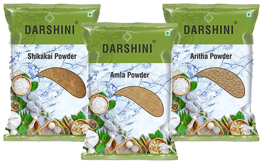 Darshini Darshini Amla Powder Aritha Powder Shikakai Powder Bhringraj Powder Hibiscus Powder (200 Each) This combo of Ayurvedic herbs can help promote hair growth, add shine to the hair, and reduce hair fall. The presence of Vitamin C is essential for hair growth. It also helps add nutrients to the hair and scalp for healthy growth and conditions the hair.