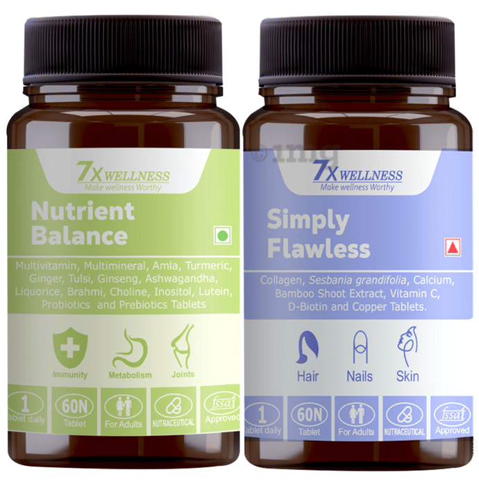 7X Wellness Combo Pack of Nutrient Balance and Simply Flawless Tablet 7X Wellness Nutrient Balance is formulated with the goodness of 13 vitamins and 11 minerals that the body fails to achieve from food sources. It is fortified with 12 powerful sources of immunity blends and 20 billion CFU probiotics. This formula contains ashwagandha, ginseng, liquorice, amla, turmeric, vitamins ( C, B3, B2, B, A), folic acid, zinc, and calcium. Nutrient balance is proven to boost energy and improve strength and stamina. This formula helps with managing stress and building immunity. It is suitable for both men and women.