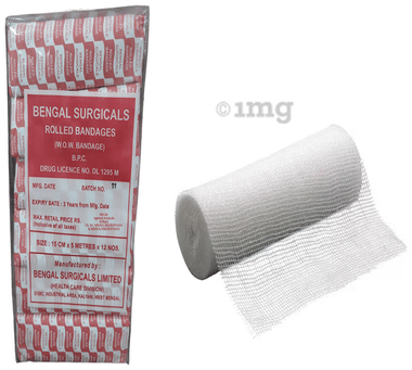 Absorbent Cotton Medical Gauze Roll Bandage is used for different types of cuts, injuries, wounds etc. Strong and convenient, these rolled bandages are used when moderate compression is required. It is a product manufactured from white bleached cotton gauze cloth of suitable quality. Manufactured by Bengal Chemical and Pharmaceutical Works Ltd. this medical roll bandage is used by doctors, dentists, and industrial safety organisations in hospitals and for individuals for first aid and home kits. The main raw material used here is bleached cotton gauze cloth of suitable quality, conforming to IS-758/1925. The width of the bandage cloth is 5 cm and the length of 5 metres. It is bleached to pure white colour, softened and freed from pieces of thread, leaf, shell, fibre, dust and other organic matter. The absorbent cotton when impregnated with capscuium celnrsin and methyl salicylate gives capscuium cotton/wool which can be used as a counter-irritant and to deal with rheumatic producing heat on undamaged skin.