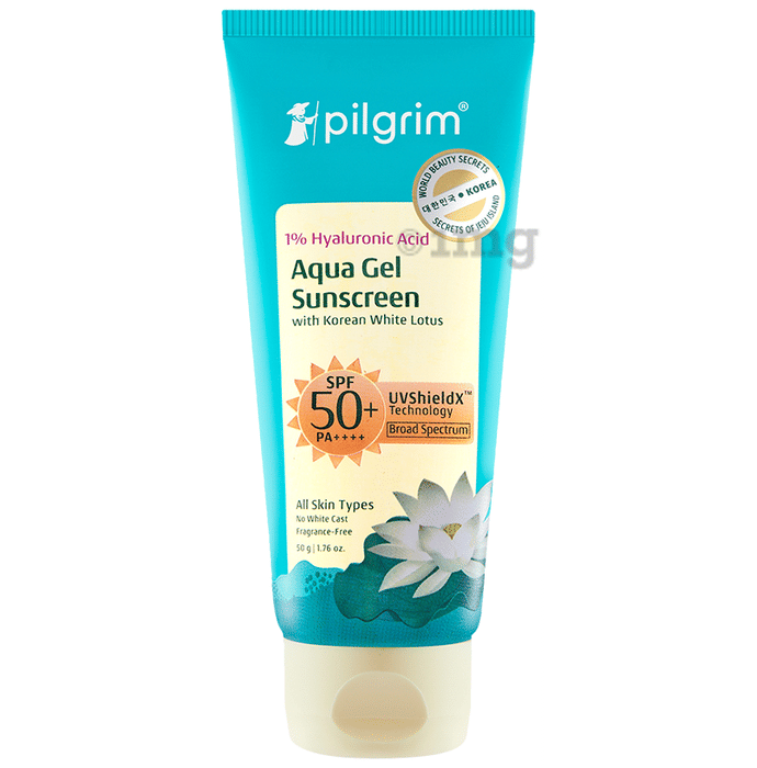 Pilgrim 1% Hyaluronic Acid Sunscreen Gel SPF 50 PA+++ is designed to help provide broad-spectrum protection against UVA, UVB, and blue light exposure. It may help shield the skin while offering hydration and a lightweight and non-greasy finish, making it suitable for daily use.