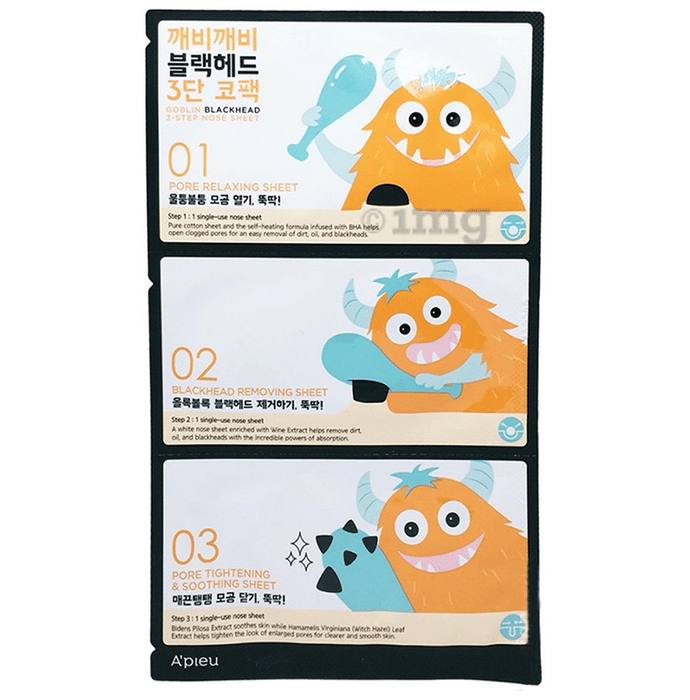A'PIEU Goblin Blackhead 3 Step Nose Sheet (14gm Each) helps to remove blackheads from the nose. It uses Bidens pilosa extract to relieve pores and Witch hazel extract to reduce pores to smooth the nose. It contains witch hazel, which helps to reduce inflammation, redness, and irritation on the skin. It also includes wine extract, which helps to improve skin tone and remove dead skin cells.