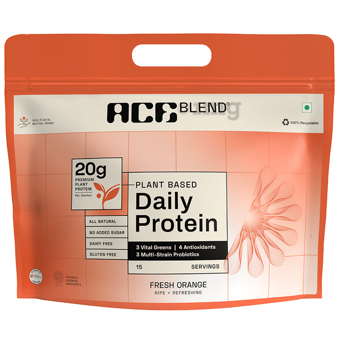 Ace Blend Daily Plant Protein Powder Full Spectrum Super Foods Sachet Orange provides the body with 100% A-grade 20gm plant-based protein, blended with 4 multi-greens, 4 natural antioxidants, and 2.5B CFU multi-strain pre and probiotics. It is crafted for daily lifestyle use as a nutritional supplement for overall wellness and protein supply.
