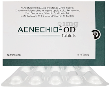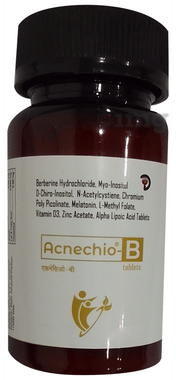 - Acnechio-AB targets acne and blemishes, helping manage and reduce their occurrence. The supplement supports overall skin vitality, promoting a healthy complexion. It offers a blend of essential nutrients that contribute to skin health. The included antioxidants assist in protecting the skin from free radicals. Alpha lipoic acid supports skin nutrition and revitalization. Zinc helps maintain skin health. Vitamin A and vitamin D3 protect against sun damage. Vitamin E acts as an antioxidant and protects the skin cells from free radical damage. Myo-Inositol and D-chiro inositol support hormonal balance. Cholecalciferol and zinc gluconate contribute to immune health, benefiting the skin. Retinol and tocopheryl acetate support collagen production, enhancing skin elasticity. Acnechio-AB tablet provides your skin with nourishment, helping it look and feel its best.