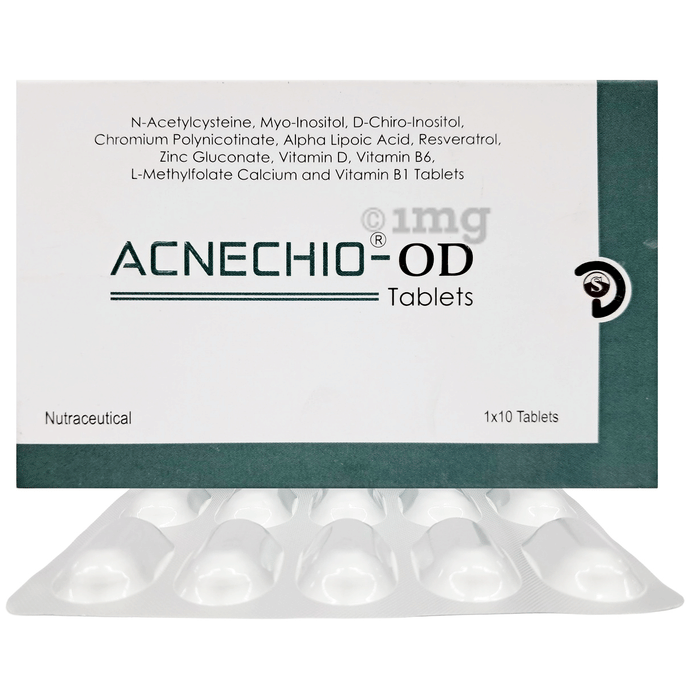 Acnechio -OD Tablet is a health supplement containing essential vitamins, minerals, and antioxidants which can help support the various bodily functions. It contains antioxidants like n-acetylcysteine, myo-inositol, d-chiro inositol, and alpha lipoic acid which eliminates damage-causing free radicals that harm the cells. Vitamin D enhances bone health, vitamin B6 supports brain health, and vitamin B1 helps produce energy in the cells.
