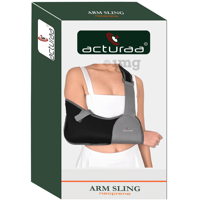 Acturaa Arm Sling is designed to support arm positioning during recovery or post-injury care. Made with a breathable neoprene-based sponge fabric, it features a soft padded shoulder strap, adjustable Velcro support, and a wide pouch that cradles the arm securely. The ergonomic structure helps keep the arm close to the body and aligned with the shoulder line. Suitable for use on either the left or right arm, this sling offers comfort during prolonged wear through its cushioned neck padding and vertical strap orientation. The design allows air circulation and helps maintain a natural resting posture of the arm.