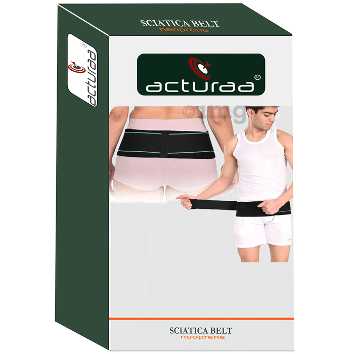 Acturaa Neoprene Sciatica Belt Universal is ergonomically designed to support the lower back and waist region with contoured comfort. The belt is made from premium neoprene material that increases body temperature, absorbs sweat, and helps release heat to keep the skin dry. It comes with an adjustable double strap for a secure fit and universal sizing, making it suitable for different body types and activities such as sports, sedentary work, or daily use.